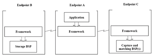 ¿©¼¸ °¡Áö ŸÀÔÀº ¸ðµÎ BIP ¸Þ½ÃÁö ÀÎÅÍÆäÀ̽º°¡ °¡´ÉÇÏÁö¸¸, ÀÌ °¡¿îµ¥ dual-roleÀº master-role°ú slave-roleÀÇ ±â´ÉÀ» µ¿½Ã¿¡ ¸¸Á·½Ã۸ç, BIP-enabled framework´Â BioAPI¿Í BioSPIÀÇ API¸¦ ÁØ¿ëÇÑ´Ù. µû¶ó¼, master-role-capable BIP-enabled framework´Â BioAPI API¸¦ ÁØ¿ëÇϰí slave-role-capable BIP-enabled framework´Â BioSPI API¸¦ ÁØ¿ëÇÏ´Â °ÍÀÌ ÀÌ µÑ »çÀÌÀÇ Å« Â÷À̶ó ÇϰڴÙ. <±×¸² 1>Àº BIP-enabled framework ÇüÅÂÀÇ ¿ø°Ý BIP endpoint·Î ±¸¼ºµÈ ÀÀ¿ë ½Ã½ºÅÛ¿¡¼ ÅÛÇø´ ÀúÀåÀÌ È¹µæ ¹× Á¤ÇÕ ±â´É°ú º°µµ·Î ÀÌ·ç¾îÁö°í ÀÖ´Â ¿¹¸¦ º¸¿©ÁÖ°í ÀÖ´Ù. À̰ÍÀº BioAPI¸¦ ÁØ¿ëÇÏ´Â Telebiometric ÀÀ¿ë ½Ã½ºÅÛÀÇ ÀüÇüÀûÀÎ ±¸Á¶¶ó ÇÒ ¼ö ÀÖ´Ù.