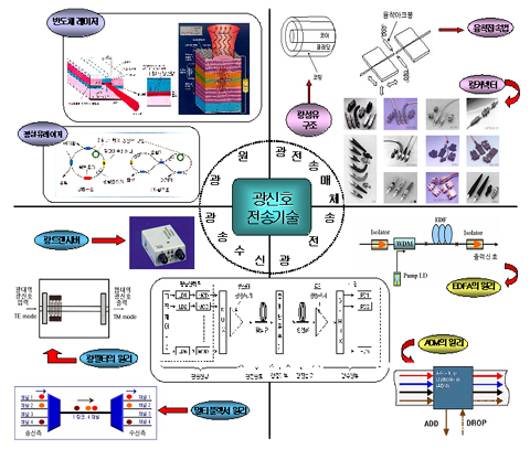 ±¤½ÅÈ£ Àü¼ÛÀ» À§ÇÑ Çٽɱâ¼ú·Î´Â ±¤½ÅÈ£ Àü¼Û¿¡ ÀÖ¾î ij¸®¾îÀÎ ºûÀ» »ý¼ºÇÏ´Â ±¤¿ø ±â¼ú°ú, ±¤¼Û¼ö½Å ȸ·Î¿Í ±¤¼Û¼ö½Å ºÎǰÀ» Æ÷ÇÔÇÏ´Â ±¤¼Û¼ö½Å ±â¼ú, ´ÙÁß Àü¼Û¹æ½Ä°ú ±¤ÁõÆø ¹æ½ÄÀ» ÅëÇØ ±¤½ÅÈ£¸¦ Àü¼ÛÇÏ´Â ±¤Àü¼Û ±â¼ú, ±¤½ÅÈ£¸¦ Àü¼ÛÇϱâ À§ÇÑ °æ·ÎÀÎ ±¤Àü¼Û¸Åü ±â¼ú µîÀÌ ÀÖ´Ù.