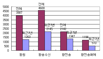 ±¤½ÅÈ£ Àü¼Û±â¼úÀÇ ºÐ¼®±â°£ Àüü Ãâ¿ø¿¬µµ[1982-2003]¿Í ±¤½ÅÈ£ Àü¼Û±â¼úÀÌ ºñ¾àÀûÀ¸·Î ¹ßÀüÇϱ⠽ÃÀÛÇÑ ÃÖ±Ù 7³â°£[1996-2002]ÀÇ Æ¯ÇãÃâ¿ø °Ç¼ö¸¦ ºñ±³Çغ¸¸é ¾Æ·¡ ±×¸²°ú °°´Ù. ÀüüÀûÀ¸·Î ±¤Àü¼Û°ú ±¤Àü¼Û¸Åü ºÐ¾ßÀÇ Æ¯Çã Ãâ¿ø °Ç¼ö´Â Àüü Ãâ¿ø¿¬µµ¿Í ºñ±³Çغ¼ ¶§ ÃÖ±Ù 7³â°£ÀÇ ºñÀ²ÀÌ ³ô°Ô ³ªÅ¸³µ´Ù.