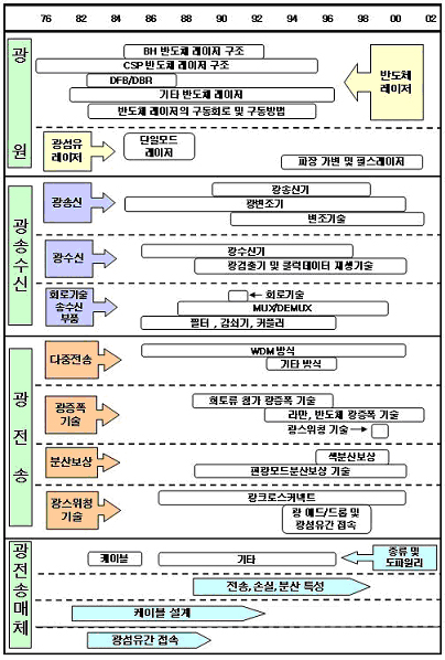 ¿À´Ã³¯ º¸ÆíÈµÈ ÀÎÅÍ³Ý ½Ã´ë¸¦ ¿°Ô µÈ °áÁ¤Àû °è±â´Â ±Ùº»ÀûÀ¸·Î ±¤Åë½Å ±â¼úÀÇ ¹ßÀü°ú ÀÌ·Î ÀÎÇÑ ´ë¿ë·® Á¤º¸ Àü¼ÛÀÌ °¡´ÉÇÏ°Ô µÈ Á¡À̶ó°í º¼ ¼ö ÀÖ´Ù. Áö³ 20¼¼±â Áß¹Ý 1959³â¿¡ ÀÌ·ç¾îÁø ·¹ÀÌÀúÀÇ ¹ß¸í°ú 70³â Á߹ݿ¡ µé¾î¿Í È®º¸µÈ Àú ¼Õ½Ç ½Ç¸®Ä« ±¤¼¶À¯ Á¦ÀÛ ±â¼úÀº ¿ì¸® Àηù¿¡°Ô ±¤Åë½Å ±â¼úÀ» ½Ç¿ëÈÇÒ ¼ö ÀÖ°Ô ÇÏ´Â Á÷Á¢ÀûÀÎ µ¿±â°¡ µÇ¾ú´Ù. ±× ÈÄ 1980³â Áß¹Ý ÀÌÈÄ¿¡ °³¹ßµÈ ¾îºç ÷°¡µÈ ±¤¼¶À¯¿Í À̸¦ ÀÌ¿ëÇÑ ±¤ÁõÆø±â ±â¼úÀº ½Ç¸®Ä« ±¤¼¶À¯¸¦ Àü¼Û ¸ÅÁú·Î ÇÑ ±¤Àü¼Û ½Ã½ºÅÛ ¿ë·®À» 20¼¼±â°¡ ³¡³ª±â Àü¿¡ ÀÌ¹Ì ÃÊ´ç ¼ö Å×¶óºñÆ®(Tb/s)±Þ ÀÌ»óÀÇ µ¥ÀÌÅ͸¦ ´ë·ú ÀúÆíÀ¸·Î Àü¼ÛÇÒ ¼ö ÀÖ´Â ¼öÁØÀ¸·Î ¿Ã·Á ³õ¾Ò´Ù. ÀÌ·¯ÇÑ ¼öÁØ¿¡ ¿À¸£±â±îÁö´Â ´ÜÀϸðµå ·¹ÀÌÀú ¹ßÁøÀÌ °¡´ÉÇÑ ¹ÝµµÃ¼ ·¹ÀÌÀú¿Í °í°¨µµ ±¤°ËÃâ ¼ÒÀÚ, ´Ù¾çÇÑ ´Éµ¿ ¹× ¼öµ¿Çü ±¤¼ÒÀÚµéÀÇ °³¹ß°ú ±â¼ú ÃàÀûµµ °°ÀÌ ÀÌ·ç¾îÁ® ¿Ô±â ¶§¹®¿¡ °¡´ÉÇÏ¿´´Ù. ƯÈ÷ Áö³ 1990³â´ë Ãʹݿ¡¸¸ ÇØµµ Å×¶óºñÆ®±Þ ±¤Àü¼Û ±â¼úÀÌ ±¤Åë½Å ¹× ±¤¼ÒÀÚ ±â¼ú ºÐ¾ß ¿¬±¸ÀÚµéÀÇ Ä¿´Ù¶õ ¸ñÇ¥¿´À¸³ª 1996³â ÃÊ¿¡ ÀϺ»°ú ¹Ì±¹ ¿¬±¸ÁøµéÀÌ ÆÄÀå ºÐÇÒ ´ÙÁß(WDM; Wavelength Division Multiplexing) ±â¼úÀ» ÀÌ¿ëÇÏ¿© 1Tb/s ±¤Àü¼Û ±â¼úÀ» ½ÇÇè½Ç ¼öÁØ¿¡¼ ¼º°øÇÏ°Ô µÊÀ¸·Î½á, ±¤Åë½Å ±â¼úºÐ¾ßÀÇ »õ·Î¿î ½Ã´ë°¡ Àü°³µÇ¾ú´Ù.