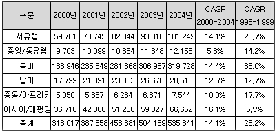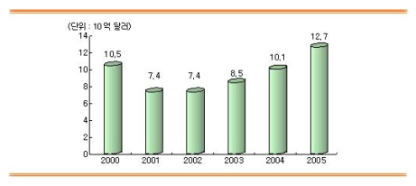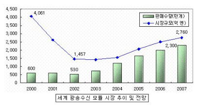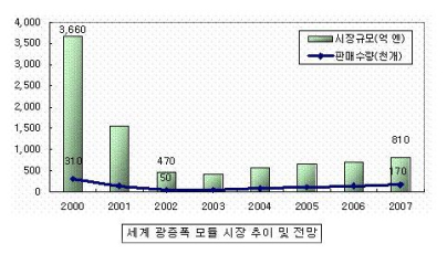 ÀÌ·¯ÇÑ ±¤Åë½Å ºÎǰ ½ÃÀåÀº Yankee ±×·ìÀÌ ¹ßÇ¥ÇÑ º¸°í (±×¸² 3)¿¡¼µµ ¾Ë ¼ö ÀÖµíÀÌ 2002³â±îÁö´Â ºÒȲÀÌ Áö¼ÓµÇ¾ú°í 2003³â ÀÌÈÄ ¼¼È÷ ȸº¹µÇ°í ÀÖÀ¸¸ç 2001³â¿¡ 74¾ï ´Þ·¯ ±Ô¸ð¿¡¼ ¿¬Æò±Õ(CAGR) 15%ÀÇ ºñÀ²·Î ¼ºÀåÇÏ¿© 2005³â¿¡´Â 127¾ï ´Þ·¯ ±Ô¸ð¿¡ À̸¦ °ÍÀ¸·Î Àü¸ÁµÈ´Ù.