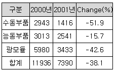 ½ÃÀå Á¶»ç ȸ»çµéÀÌ ¹ßÇ¥ÇÑ ³»¿ëµéÀ» º¸¸é ÀÌ °°Àº ±¤Åë½Å ºÎǰ ¾÷°èÀÇ ºÒȲÀÌ ¼öÄ¡·Î ³ªÅ¸³²À» º¼ ¼ö ÀÖ´Ù. <Ç¥ 2>¿¡´Â Gartner ±×·ìÀÌ ¹ßÇ¥ÇÑ ¼¼°è ±¤Åë½Å ºÎǰ ½ÃÀå ±Ô¸ð¸¦ ³ªÅ¸³»¾ú´Âµ¥, 2001³âÀÇ ¼¼°è ±¤Åë½Å ºÎǰ ½ÃÀå ±Ô¸ð°¡ ¾à 74¾ï ´Þ·¯·Î 2000³â(¾à 120¾ï ´Þ·¯) ´ëºñ 38% ÀÌ»ó ¸¶À̳ʽº ¼ºÀåÇÑ °ÍÀ¸·Î º¸°í ÀÖ´Ù.