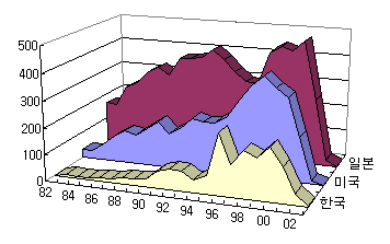 ±¤½ÅÈ£ Àü¼Û±â¼úÀÇ °¢ ±¹°¡º°·Î Ãâ¿ø¿¬µµº° Ãâ¿ø°Ç¼ö(¹Ì±¹: µî·Ï°Ç¼ö) ¹× ±â¼úº° Ãâ¿ø°Ç¼ö(¹Ì±¹: µî·Ï°Ç¼ö)¿¡ ´ëÇÑ µ¿ÇâÀ» »ìÆìº¸¸é Çѱ¹Àº 1994³â¿¡ Ãâ¿ø°Ç¼ö°¡ ¾à°£ °¨¼ÒÇÏ¿´´Ù°¡ 1996³â¿¡ ±Þ°ÝÈ÷ Áõ°¡ÇÏ°í ´Ù½Ã ¿ÜȯÀ§±â¿´´ø 1997³â¿¡ ±Þ°ÝÈ÷ °¨¼ÒÇÏ¿´´Ù. ÀϺ»Àº 1994³âÀ» ÀüÈÄ·Î Ãâ¿ø°Ç¼ö°¡ ¾à°£ÀÇ °¨¼Ò¸¦ º¸ÀÌÁö¸¸ ´ëüÀûÀ¸·Î ²ÙÁØÈ÷ ³ôÀº ºñÀ²·Î ƯÇã°¡ Ãâ¿øµÇ°í ÀÖÀ¸¸ç ¹Ì±¹Àº Ưº°È÷ ´«¿¡ ¶é¸¸ÇÑ ±×·¡ÇÁÀÇ Áõ°¨ ¾øÀÌ ÀüüÀûÀ¸·Î ²ÙÁØÈ÷ ƯÇãµî·Ï °Ç¼ö°¡ Áõ°¡Çϰí ÀÖ´Ù. ±â¼úº°·Î Çѱ¹°ú ¹Ì±¹Àº ±¤¿øÀÌ Â÷ÁöÇÏ´Â ºñÀ²ÀÌ °¡Àå ³ô°í ÀϺ»Àº ±¤¼Û¼ö½ÅÀÌ Â÷ÁöÇÏ´Â ºñÀ²ÀÌ °¡Àå ³ô´Ù´Â Â÷À̰¡ ÀÖ´Ù.
